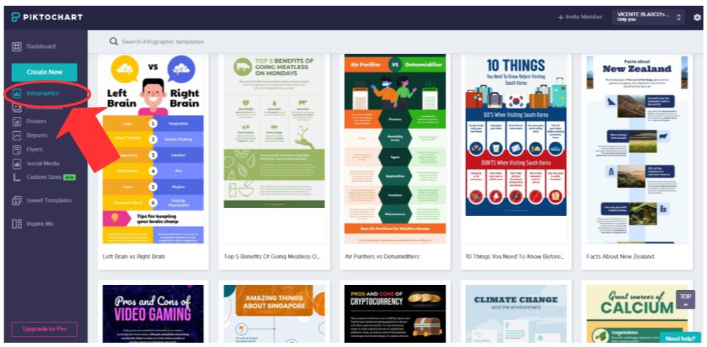 Una vez dentro, para empezar a trabajar en el diseño de tu infografía con Piktochart, no tienes más que ir al menú izquierdo del dashboard donde dice "infographic".Tras clicar en él se te mostrarán diferentes opciones de diseño, desde puedes optar por crear un nuevo trabajo totalmente de cero o crear tus gráficos partiendo de una plantilla diseñada previamente.